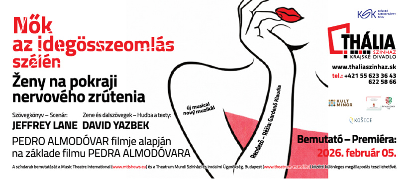 A 2025/2026-os évad harmadik bemutatója egy fergeteges musical, amely a humor és a szenvedély táncát járja – Pedro Almodóvar világhírű filmjének sodró színpadi adaptációja, a „Nők az idegösszeomlás szélén” érkezik a kassai Thália Színház színpadára.
